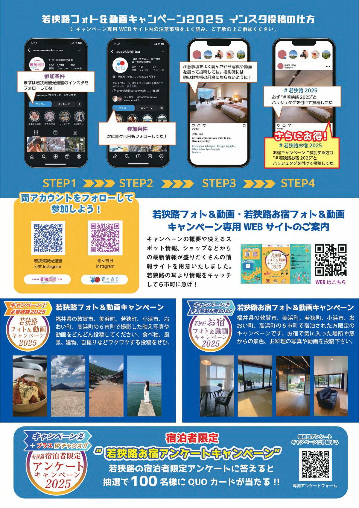 ・応募者は、若狭湾観光連盟と青々吉日の公式インスタグラムをフォローした上、宿泊施設で撮影した写真等を「#若狭路お宿2025」をつけてインスタグラムに投稿します。