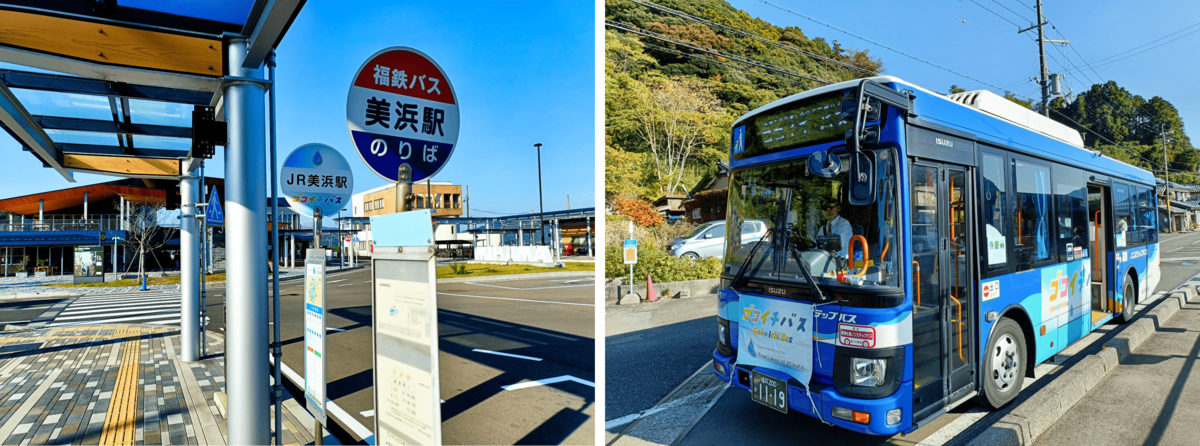 (左)ゴコイチバスJR美浜駅停留所 (右)ゴコイチバス・イメージ(車種複数で運行)