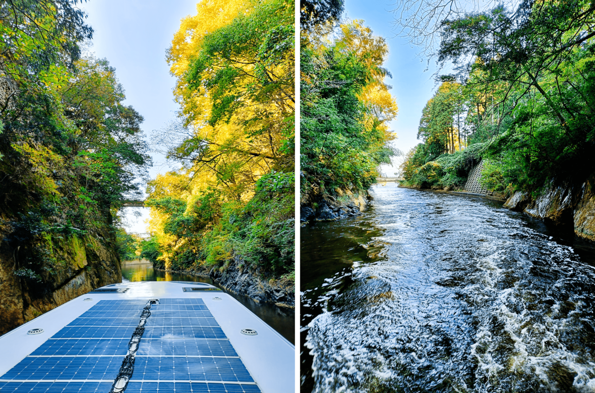 国内初・再生可能エネルギー活用の電池推進遊覧船は、低層で独特のフォルム。エンジン音がなく、振動が少ないのが特徴で、自然&野鳥観察に最適とのこと。この日はクルーズ中に野鳥が多くみられ、その鳥の名を船内で配布された野鳥リストと照合して知る楽しさがありました。またカワセミも生息していて、運がよければ見ることができるとか。今回は残念ながら見られませんでしたが、猿が岸辺に登場して船内が盛り上がりました。