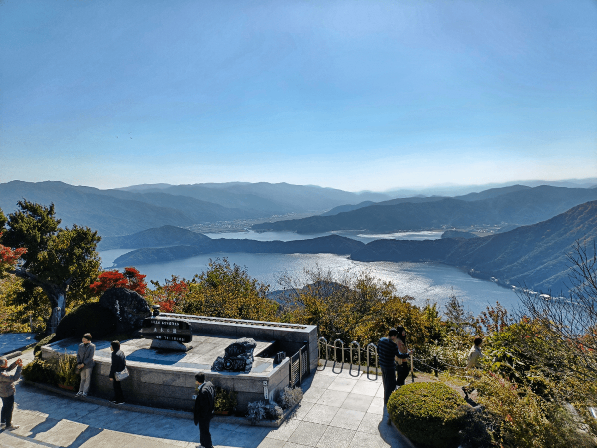 いよいよ、山頂に到着です。眼下に広がる三方五湖の大パノラマ。360度・全方位の感動が押し寄せてきました。公園には五湖テラス、若狭テラスなど絶景を望む5つのテラスがあり、それぞれに違う景色を見せてくれます。