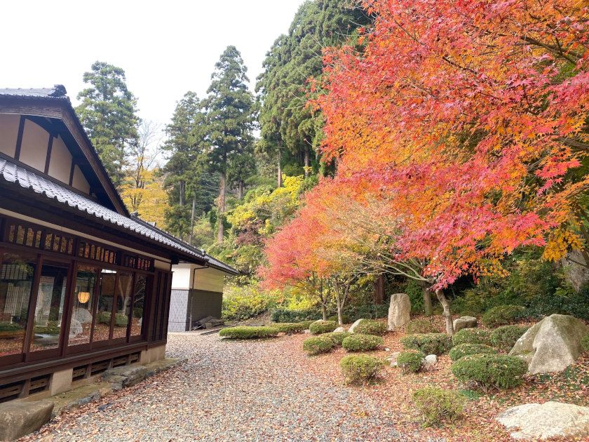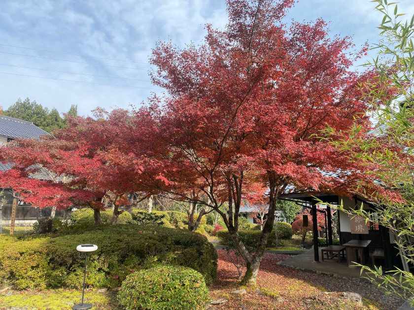 【紅葉状況】資料館横のモミジは見ごろです。赤、オレンジ、黄が混ざり合っていてとても風情があります。