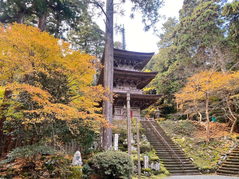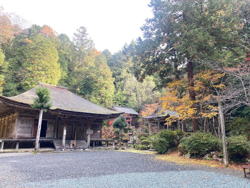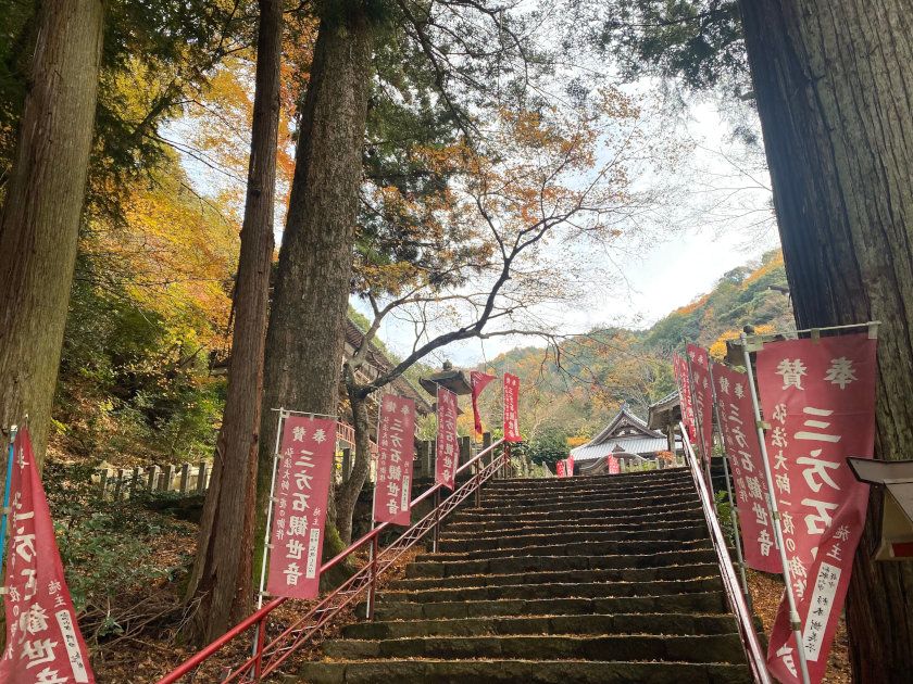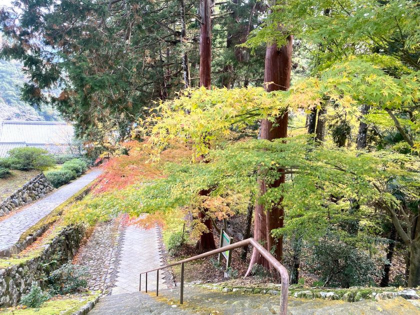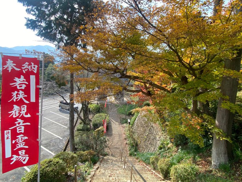 【紅葉状況】札所前のモミジは見ごろが終わり、地面に落ちていました。階段のモミジは少しずつ色付いてきています。
