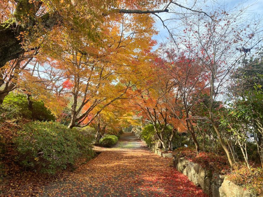 【紅葉状況】参道のモミジが赤と黄色に色付き、鮮やかなモミジのトンネルを作っています。本堂前は残念ながら散っていましたが、境内のモミジはまだ見ごろです。