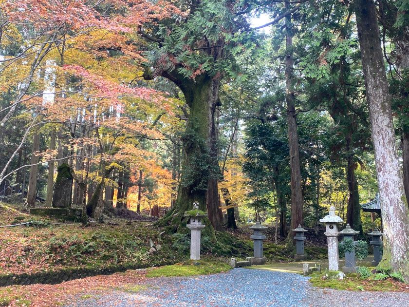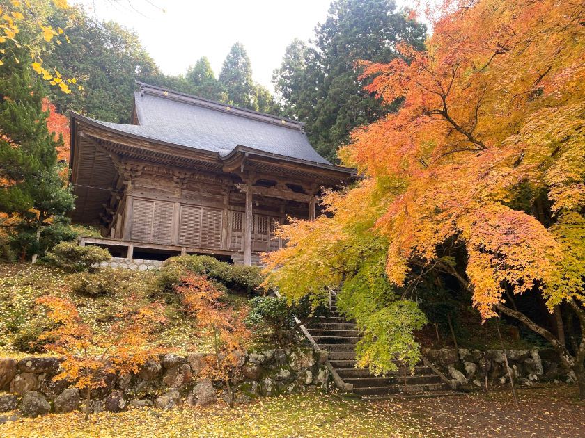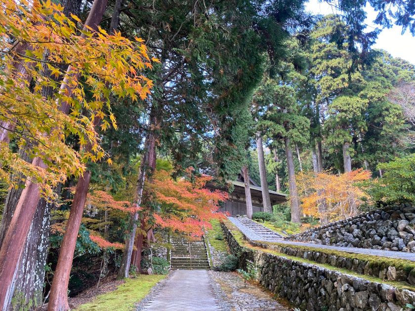 【紅葉状況】参道沿いのモミジが今が見ごろです。前日の雨で少し散ってしまっていますが、本堂までの道を紅葉を楽しみながら歩けます。本堂前のモミジは例年より早く、見ごろは終わっていました。