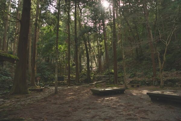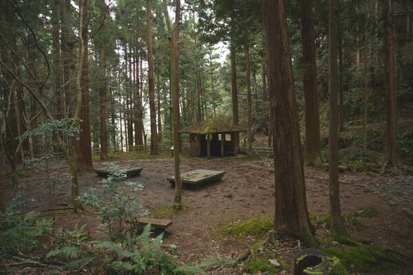 その先の空き地には、木漏れ日が差し込む小さな東屋があります。日本の聖地では、このような場所が心と体を整える緩衝空間として設けられてきました。