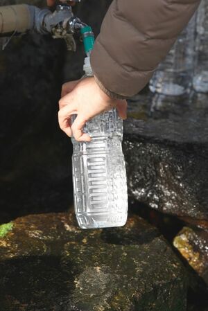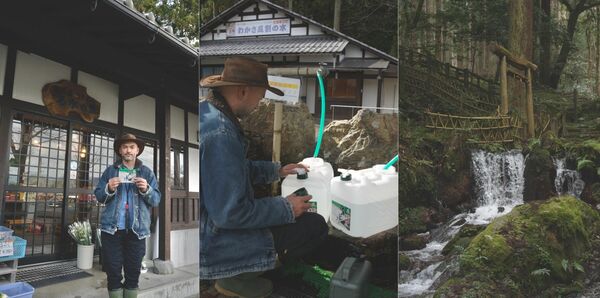 訪問者はまず、同じ地下水脈から湧き出る水を汲める採水場に到着します。地元の人々は10〜20リットルの容器を複数持参することが多く、電車で訪れる人は持ち運びしやすい5リットル程度を汲むのが一般的です。週末であっても、静かに順番を待ちながら水を汲む光景が見られます。ここでの水汲みは演出された体験ではなく、今も続く日常の営みなのです。