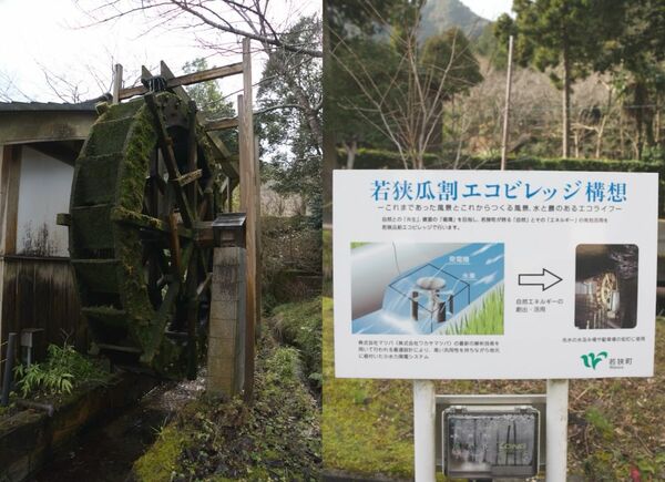 湧水のそばには、今も静かに回り続ける木製の水車があります。かつて生活に欠かせない存在だった水車は、人と水との関係を今に伝えています。