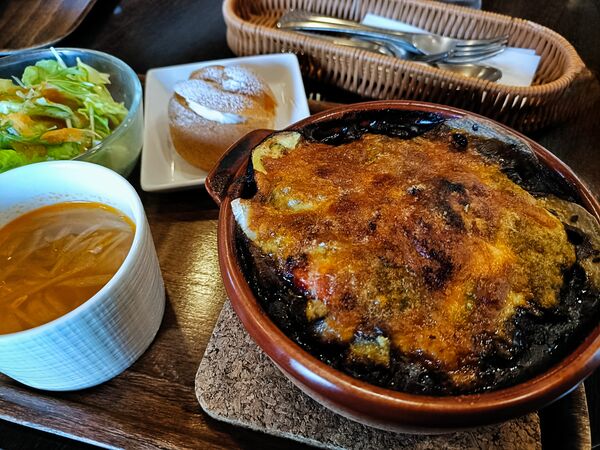 こんがり焼けたチーズの下には、熱々のカレーが。バジルツナが和風の味わいを生み出していますね。野菜はきのこやレンコン、ナス、トマトなど。それに玉子が中に隠されて、嬉しいサプライズとなりました。付属のオニオンスープやサラダのレベルも高いです。