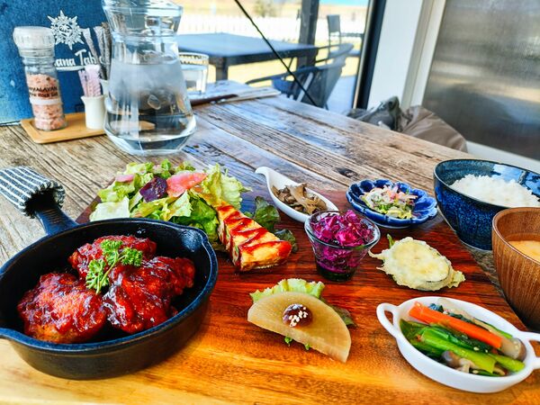 その象徴ともいえるのが、数量限定のプレートランチ。週替わりで内容は変化します。取材日当日のメインは、ヤンニョムチキン。オリジナルはにんにくとコチュジャンで甘辛く味付けした韓国料理ですが、これを優しい味にアレンジしていました。嬉しいことに、彩鮮やかな野菜の副菜が豊富に盛り付けられています。栄養のバランス、味付けの両方とも大満足の内容でした。プレートランチの他にも、パスタやトントロ丼、オムライス、カレーなど、試してみたいメニューが多数用意されています。