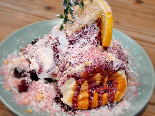 続いて、もうひとつの看板メニューであるパンケーキをいただきました。そのビジュアルは、きっと貴方のスイーツ中枢を刺激すること間違いありません。私が選んだのは「5種のベリー&ココナッツのパンケーキ」。クリームの白とベリーの鮮やかな赤のコントラストが見事。パンケーキのふわモチ食感、ベリーの甘みと酸味、たっぷりのクリームに大満足です。豪華な外見ですが、食べやすさを追及し、食感の変化など様々な角度から工夫されているとのことでした。パンケーキには季節のフルーツを使用した期間限定商品もあり、訪れるたびにメニュー選びに苦労しそうです。丼のミニサイズとハーフ・パンケーキのセットあるので、大食いの方以外でもぜひ両方の味を楽しんでください。