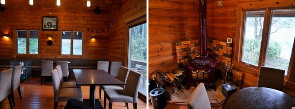 敦賀市の老舗和菓子店「松原庵」が創ったこちらのお店。内装は和ではなく洋で、おしゃれなロッジ風の造りになっています。中に入ると、窓際に設置された暖炉が存在感を示しています。山の麓という環境なので、四季折々の変化を楽しめるお店といえるでしょう。