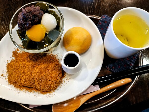 こうなると、スイーツ・メニューへの期待は、俄然高まります。ここは母体の「松原庵」に敬意を表し、「和」で攻めることにしましょう。わらびもち、抹茶ゼリー、各種あんみつなどがありますが、いろいろ試したい人には「野坂茶屋セット」がお薦め。あんみつ、わらびもち、みるくまんじゅうの野坂3種の神器が一度に味わえます。個人的には、わらびもちの食感とあんみつの寒天&黒蜜がド・ストライク。また、みるくまんじゅうはバターやクリームをたっぷり使った贅沢生地にコクのある柔らかいみるく黄身あんを包んだ焼きまんじゅうで、この味もしっかり記憶にインプットされました。