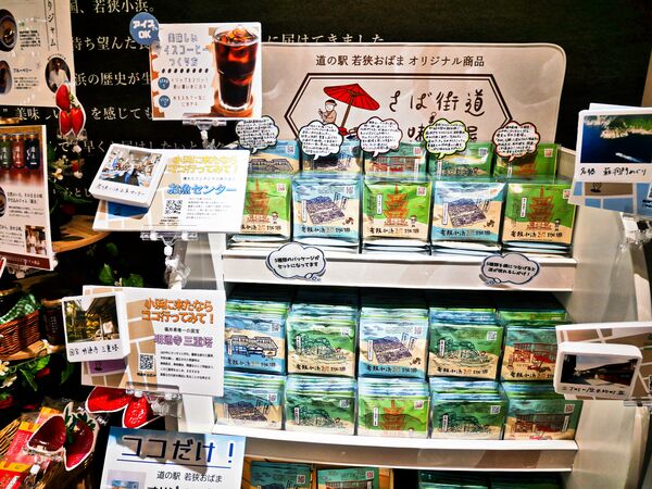 「道の駅若狭おばま」のオリジナル商品は、ぜひチェックしましょう。愛らしいデザインのオリジナルキャラクター・鯖丸グッズは好評で、商品もどんどん増えているようです。そのほか地元食材を活用したプリン、どら焼き、根昆布だし、コーヒー等々。
