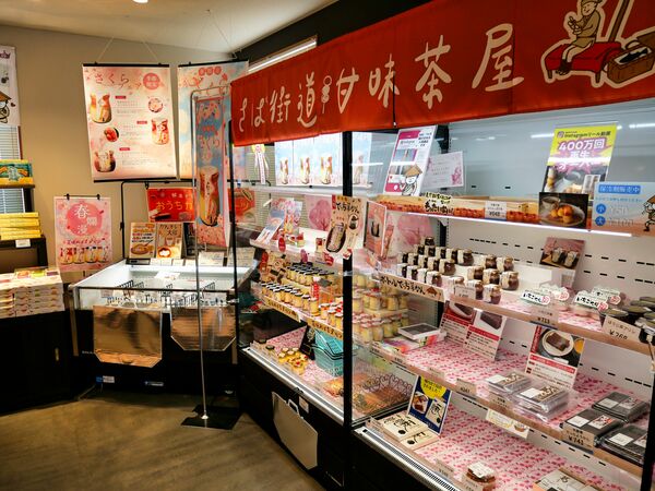 福井のお菓子も、こちらのコーナーに勢ぞろい。お土産として買うもよし、旅ナカのおやつに選ぶもよし。地元老舗和菓子店の生菓子もあります。