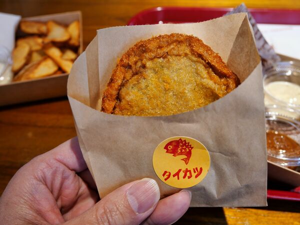 もうひとつ、注目してほしいのが「タイカツ」。小浜のソウルフードとして、よくスーパーで売られている商品です。魚のすり身をカツにしたものですが、原料にレンコ鯛が使われています。スーパーではパックで売られているので、食べるときに家で温めるのが通常。こちらでは出来立てを食べることができるので、地元でも貴重な体験といえるでしょう。