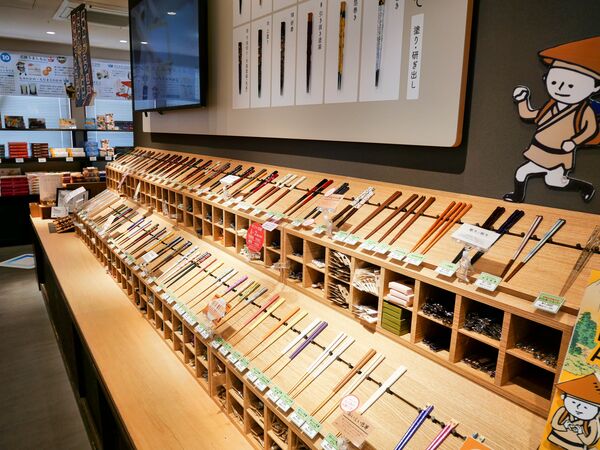 「まち」コーナーの注目は、小浜の伝統工芸品である若狭塗箸です。その歴史は約400年にわたり、全国の塗箸市場の約8割のシェアを占めるのだとか。小浜への旅を記念して、自分好みの箸を探してみるのもおススメです。