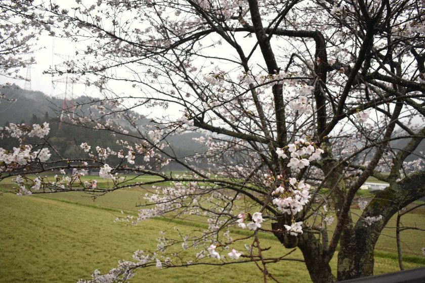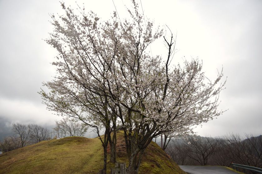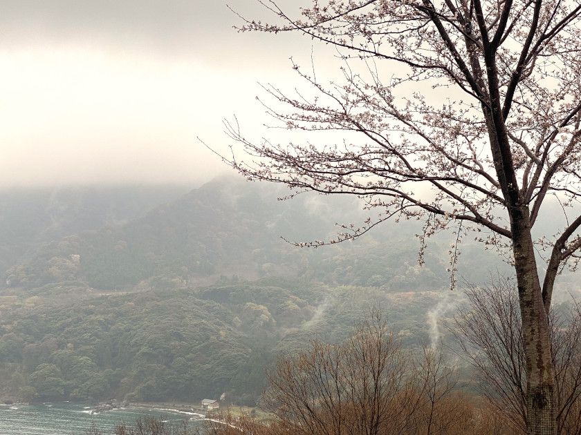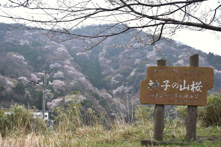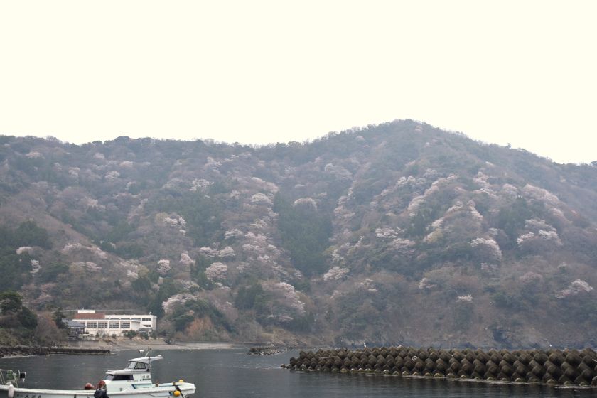 神子(みこ)という集落から山の斜面に見える山桜です。集落や漁村から見て楽しみます。