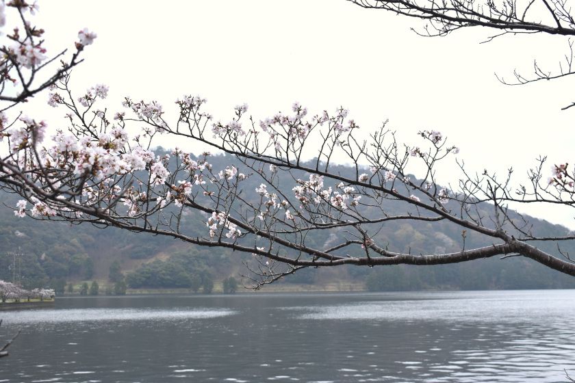 湖が見渡せる公園です。七分咲きの桜の木もありますが、ほとんどが満開です。