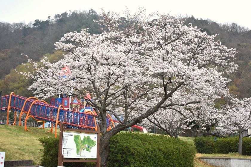 満開の桜の中、遊具で遊ぶのが楽しくなります。