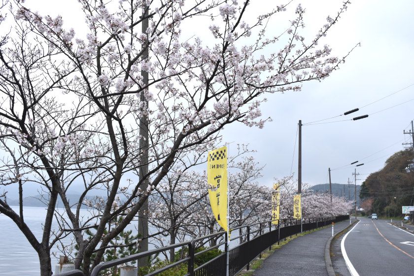 県道216号沿い、三方五湖の「水月湖」のほとりに桜が並んでいます。どの桜の木も満開で見ごたえがあります。