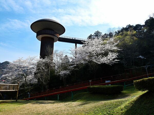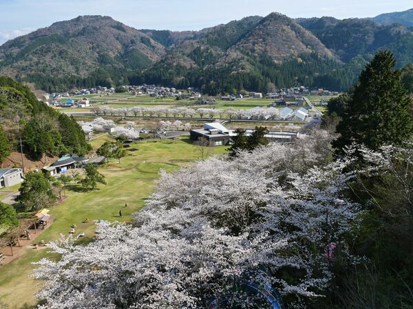 しばらく進み、きのこのテーマパーク・きのこの森に到着。以前訪れたことがあったが、その時に桜があるのを確認していた。予想したとおり、素晴らしい光景。家族で楽しめる場所だ。