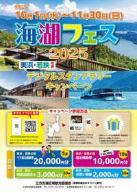 三方五湖周辺の観光地・観光施設を巡ってデジタルスタンプを集めれば抽選で美浜町・若狭町の宿泊券や特産品が当たります!