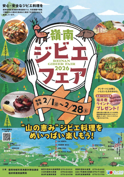 | 主催 | 嶺南地域有害鳥獣対策協議会・福井県嶺南振興局 敦賀市農林水産振興課・若狭町農林水産課 小浜市農林水産課・おおい町農林水産課 美浜町産業政策課・高浜町産業振興課 |